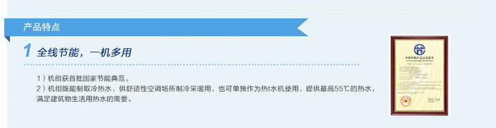 2)機組既能制取冷熱水,供舒適性空調場所制冷采暖用,也可單獨作為熱t水機使用,提供最高55度的熱水,滿足建筑物生活用熱水的需要。