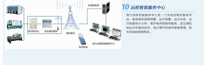 格力遠程智能服務中心是一個先進的售后服務平臺,能夠提供故障預警、運行預警、運行診斷、運行數據統計分析、維護保養提醒等服務,是空調機組運行在最優狀態,減少用戶的保養維修費用,延長機組的使用壽命。